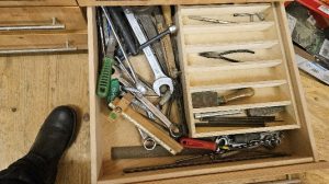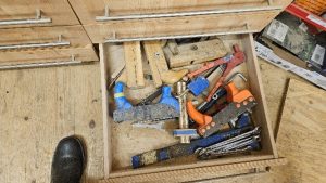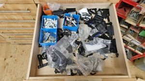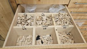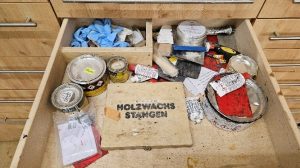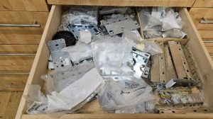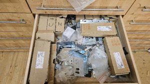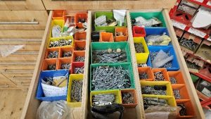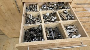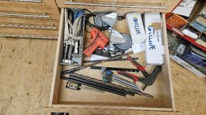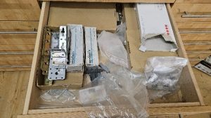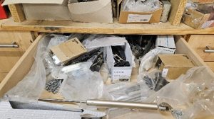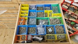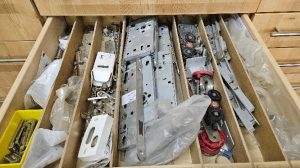 25061 – Pz. 67) Posten Kleinteile wie: Holzdübel und Lamellen, Posten Beschläge, diverse Ersatzteile, Türschlösser, div. Lehren, Schrauben, Fettpresse, Bohrer, Handwerkzeug, Lötpistole, Handhobel, Holzwachsstangen uvm. in 25 Laden