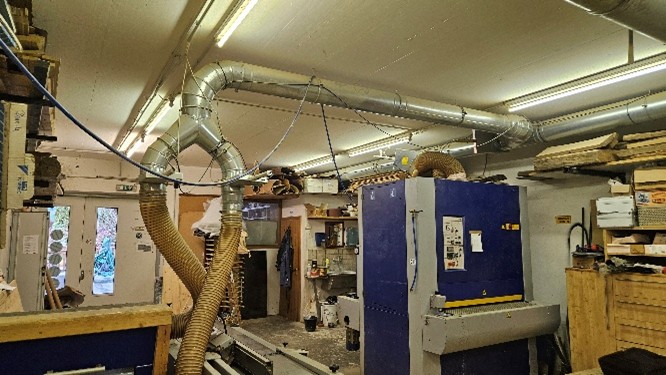 25061 – Pz. 50) Verrohrung Absaugung für sämtliche Maschinen, bestehend aus: diverse Stahlrohren, Bögen, Rohrschellen mit Schnellklemmsytem und Dichtungen, Schlauchschellen, Abzweiger, H/SE Industrie Absaugschläuche, div.