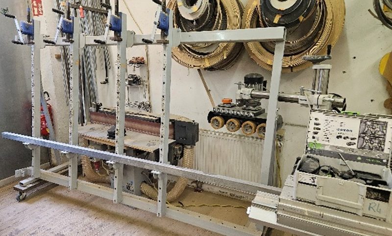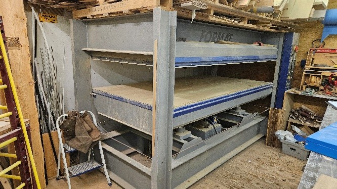 25061 – Pz. 47) Kantenpresse mit 4 Druckpressen, Größe 2,70×1,70m, auf fahrbarer Vorrichtung montiert Für weitere Informationen benutzen Sie bitte unser Kontaktformular