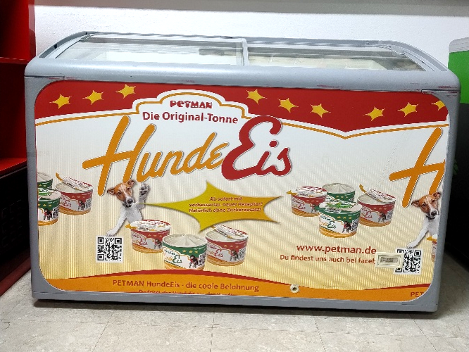 25063 – Pz. 4) Tiefkühltruhe mit Glasschiebedeckel „Hunde-Eis“, 258 dm³, Type NUCAB AT 300, 220-240V, 310 W, Energieaufnahme 1,8 kWh/24h, Isolierung 7 cm, Aussenmaß: 1,23×0,65×0,90m,