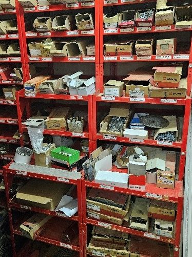 25061 – Pz. 302) Würth Regal 8 Felder mit 4 Laden, diverse Ablagen und 2 Eckfelder Pz. 303) 118 Pkg. Schrauben angebraucht Pz. 304) 5